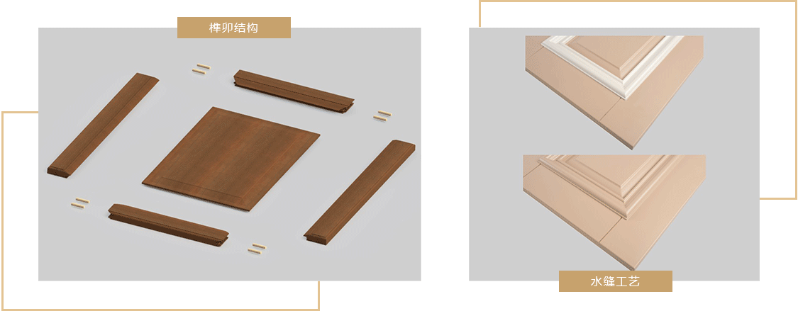 | 中纤板一次铣型,膜皮被3D真空吸塑机高温高压一次成型,不需要封边,结构稳定,防水防潮。 | 360度包裹线条,45度斜边拼框,立体感更好。 |