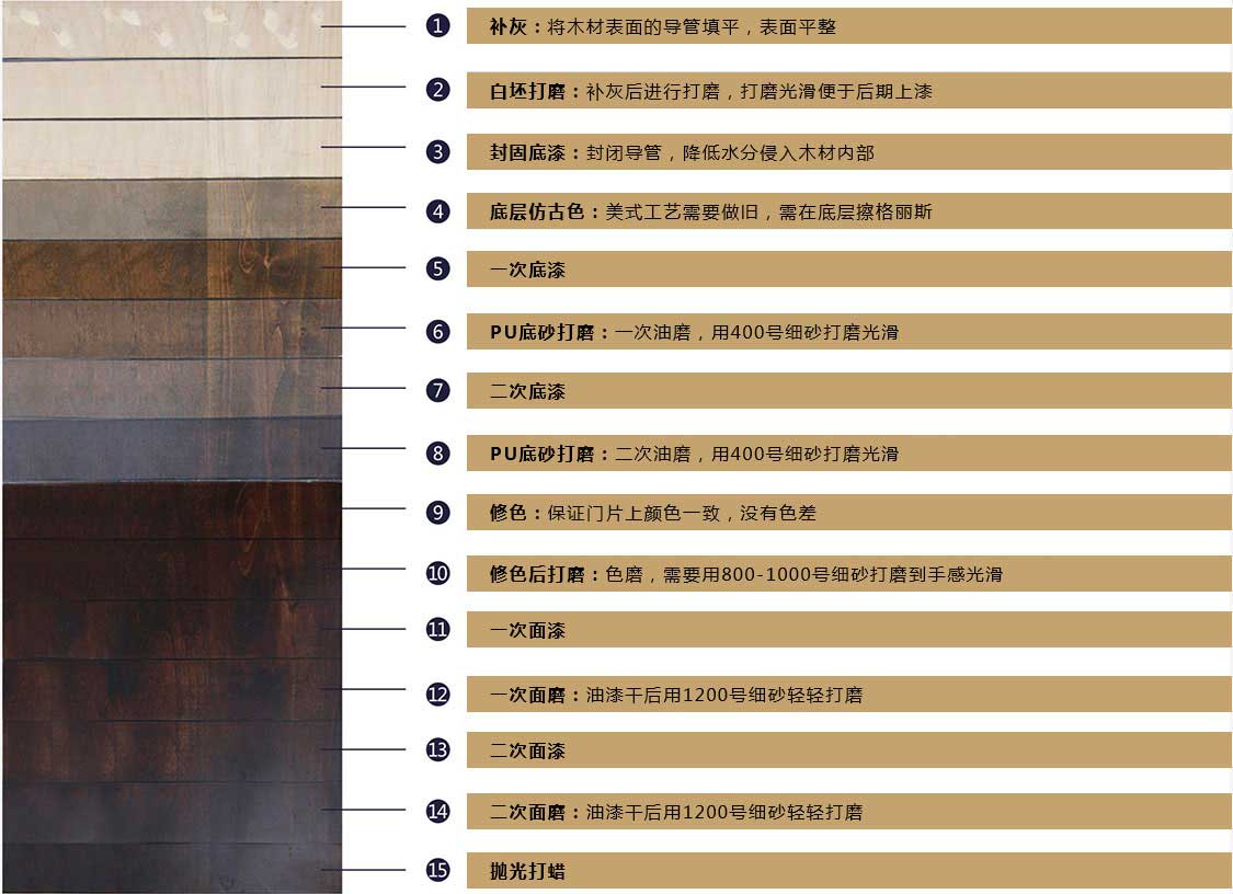 封固底漆工艺,锁住实木水分,降低实木开裂变形的几率;保护实木纹理色泽,纹理清晰美观。